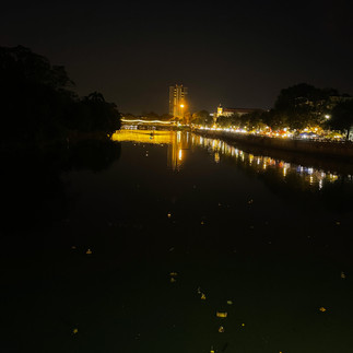 As we walked towards the middle of the bridge we looked down into the water and saw a good amount of krathongs. Most of them unfortunately had their candles blown out though so in the darkness of the night it was hard to see and get good pictures of them.